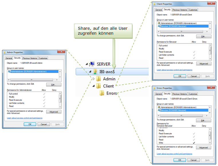 Client (und alle Unterordner) | Lese- und Ausführberechtigung für alle Benutzer, die IBI-aws Hinweise angezeigt bekommen sollen. |
