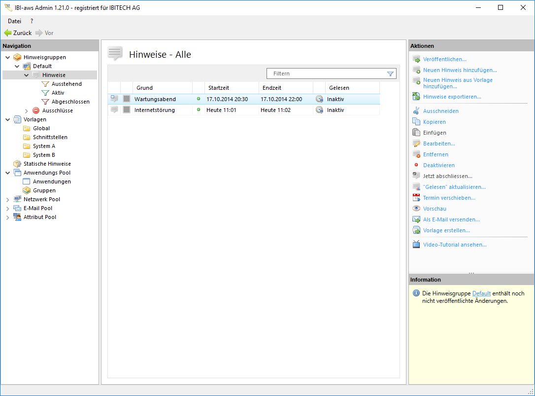 Eine Vorlage dient dazu, das Erstellen eines Hinweises zu beschleunigen. Ist eine Vorlage einmal erstellt worden wird anschließend nur noch der Startzeitpunkt benötigt, um aus der Vorlage einen vollständig einsatzbereiten Hinweis zu erzeugen.