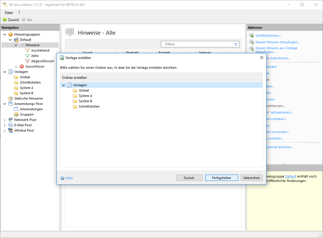 Durch einen Klick auf die Aktion, öffnet sich der Dialog zur Erstellung einer Vorlage. Das Feld Hinweis wird in diesem Fall mit den Daten des markierten Hinweises abgefüllt.