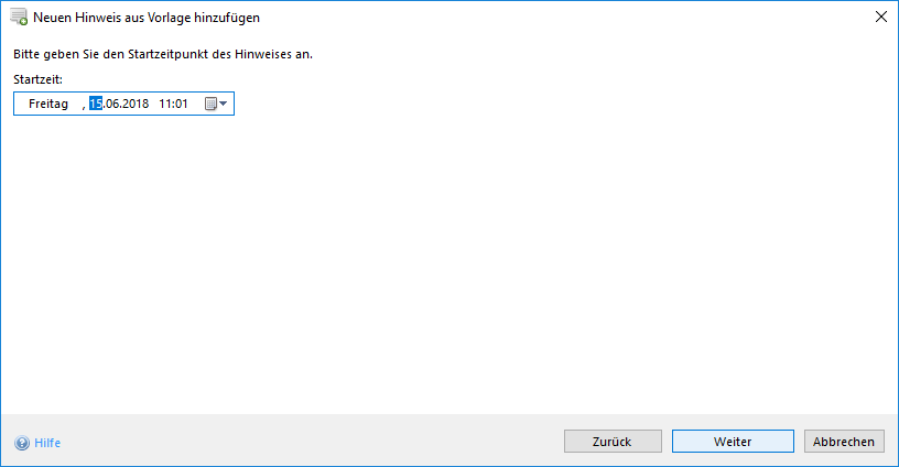 Die nun folgenden Schritte sind analog zur zuvor beschriebenen Variante (Innerhalb der Hinweisliste). Zunächst wird die Startzeit des Hinweises benötigt.