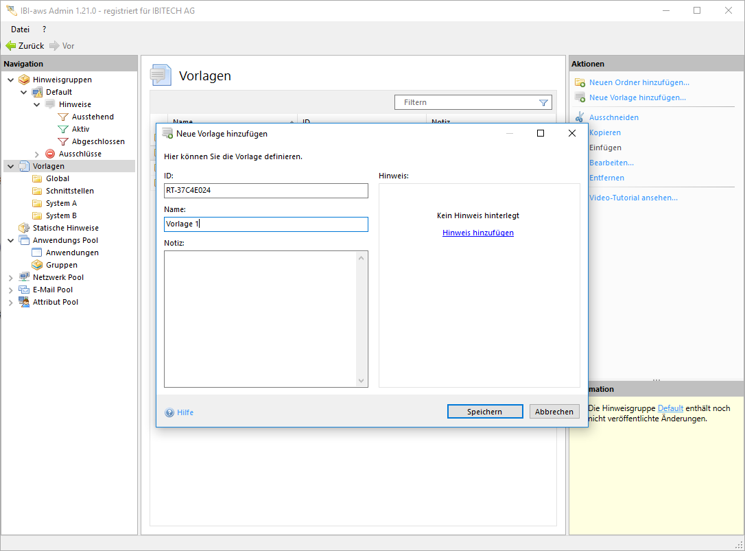 Um eine Vorlage erstellen zu können, wird neben dem Hinweis, welcher über dem Link Hinweis hinzufügen hinzugefügt wird, zusätzlich eine eindeutige ID (um die Vorlage später einfacher wiederfinden zu können) und ein Name benötigt. Bei Bedarf kann auch eine Notiz hinterlegt werden.
