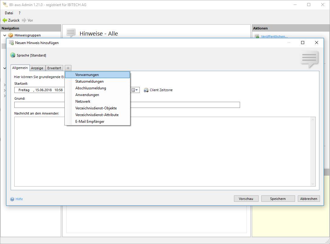 Wenn IBI-aws eine Anwendung erkennt, die dem Hinweis zugeordnet ist, dann wird die aktuelle Vorwarnung angezeigt. Erkennt IBI-aws dieselbe Anwendung noch einmal, wird diese Vorwarnung nicht wieder angezeigt.Deaktiviert