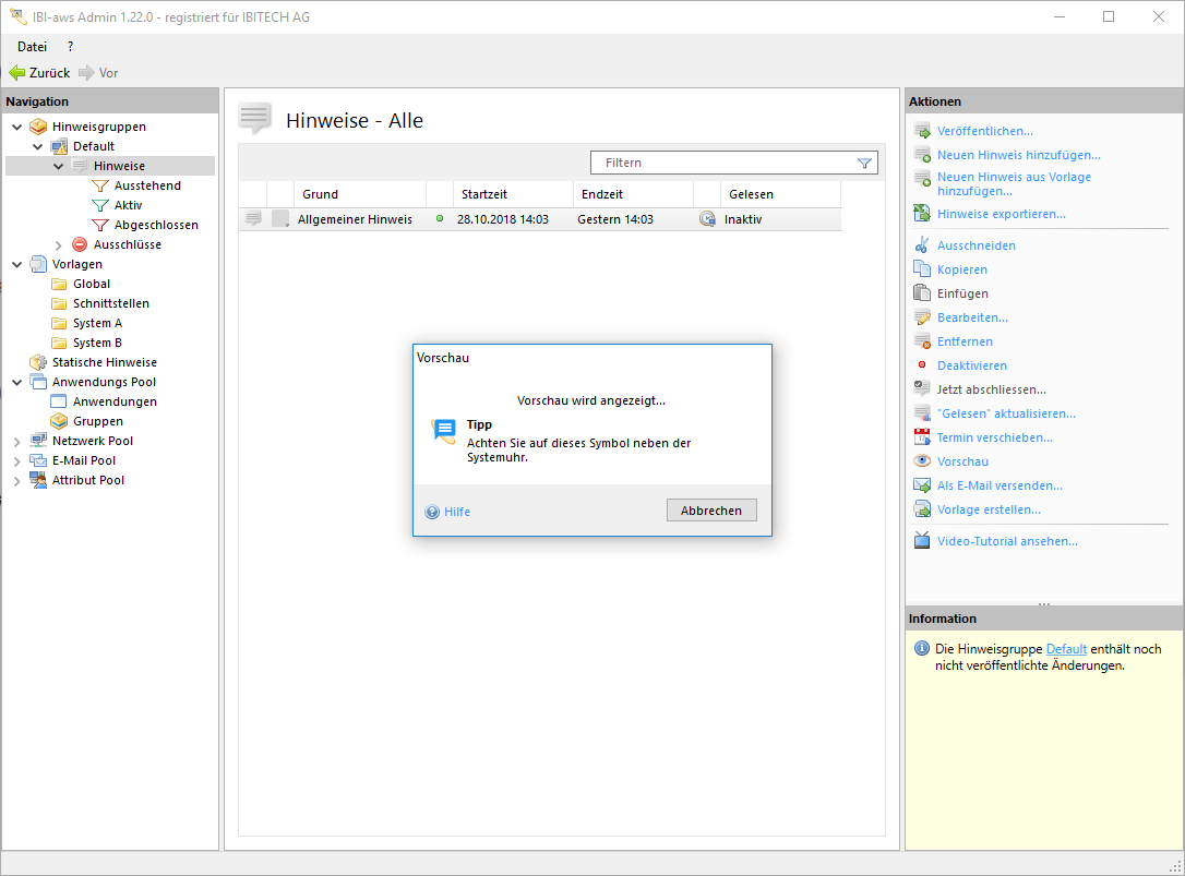 Je nach gewählter Anzeigeart des Hinweises wird nach dem Starten der Vorschau der Hinweis entsprechend angezeigt. Solange der Hinweis angezeigt wird, weist der IBI-aws Admin mit einem Fenster (Abbildung 1) darauf hin. In diesem Fenster befindet sich eine Schaltfläche, mit deren Hilfe die Vorschau beendet werden kann. Die Vorschau beendet sich auch dann, wenn Sie den Hinweis über dessen Schaltfläche Hinweis ausblenden schliessen.