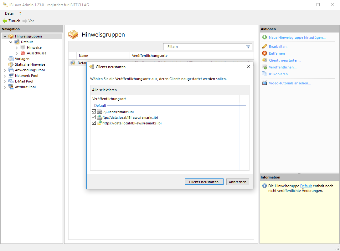 Mittels der Funktion Clients neustarten können alle zu der Hinweisgruppe gehörenden IBI-aws Clients neugestartet werden. Diese Funktion wird verwendet um Aktualisierungen einzuspielen.