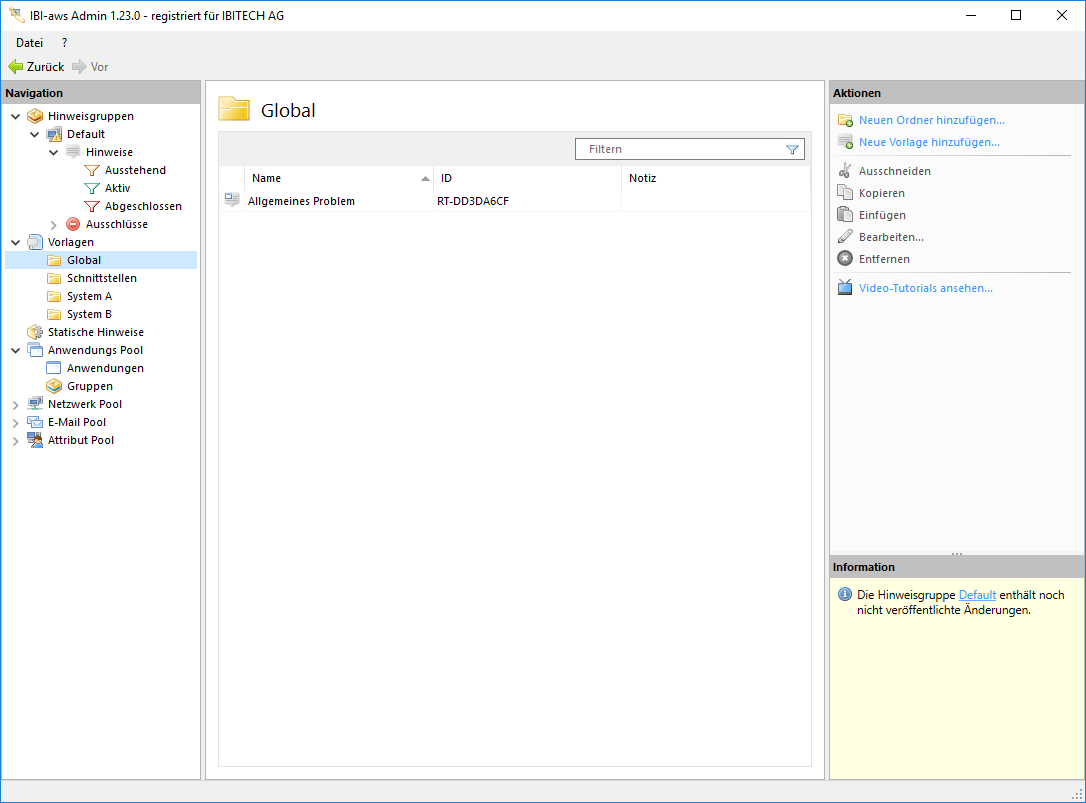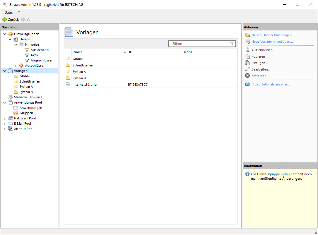 Die Vorlagen werden in einem separaten Bereich Vorlagen gehalten und stehen allen Hinweisgruppen zur Verfügung. Zur besseren Organisation können die Vorlagen in Unterordner abgelegt werden.