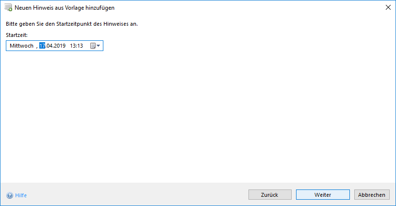 Die nun folgenden Schritte sind analog zur zuvor beschriebenen Variante (Innerhalb der Hinweisliste). Zunächst wird die Startzeit des Hinweises benötigt.