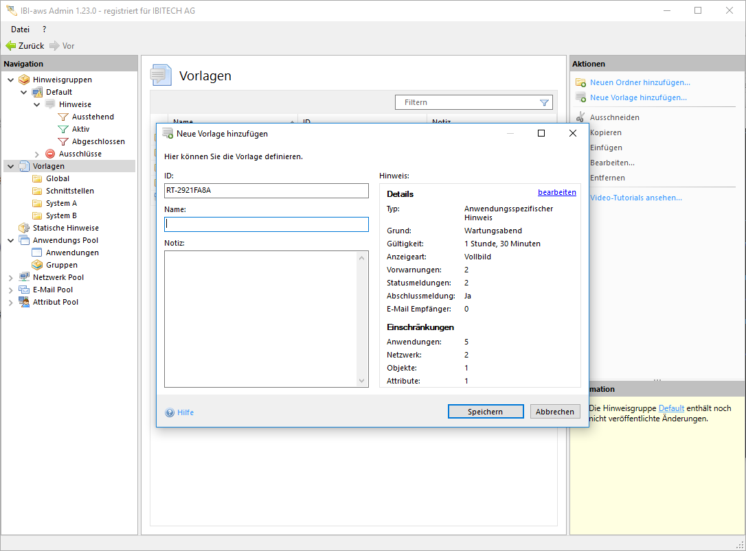 Um eine Vorlage erstellen zu können, wird neben dem Hinweis, welcher über dem Link Hinweis hinzufügen hinzugefügt wird, zusätzlich eine eindeutige ID (um die Vorlage später einfacher wiederfinden zu können) und ein Name benötigt. Bei Bedarf kann auch eine Notiz hinterlegt werden.