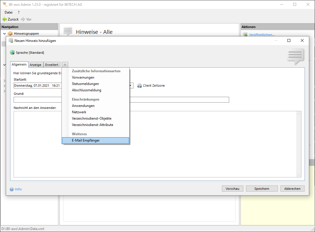 In diesem Reiter die Empfänger für den E-Mail Versand verwaltet werden. Als E-Mail Empfänger können sowohl einzelne E-Mail Adressen als auch Gruppen verwendet werden.