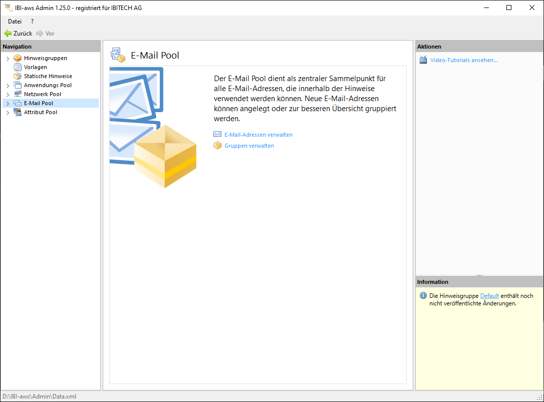 Der E-Mail Pool dient als zentraler Sammelpunkt für alle E-Mail-Adressen, die gegebenenfalls für die Versendung eines Hinweises benötigt werden. Zur besseren Übersicht können E-Mail Adressen analog zu den anderen Pools gruppiert werden.