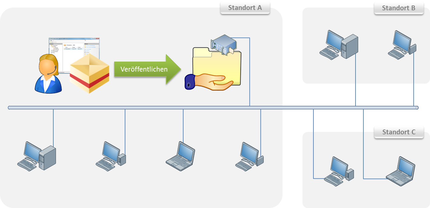 - Alle zu erreichenden Clients sind im gleichen Netzwerk und haben Zugriff auf den zentralen Share.