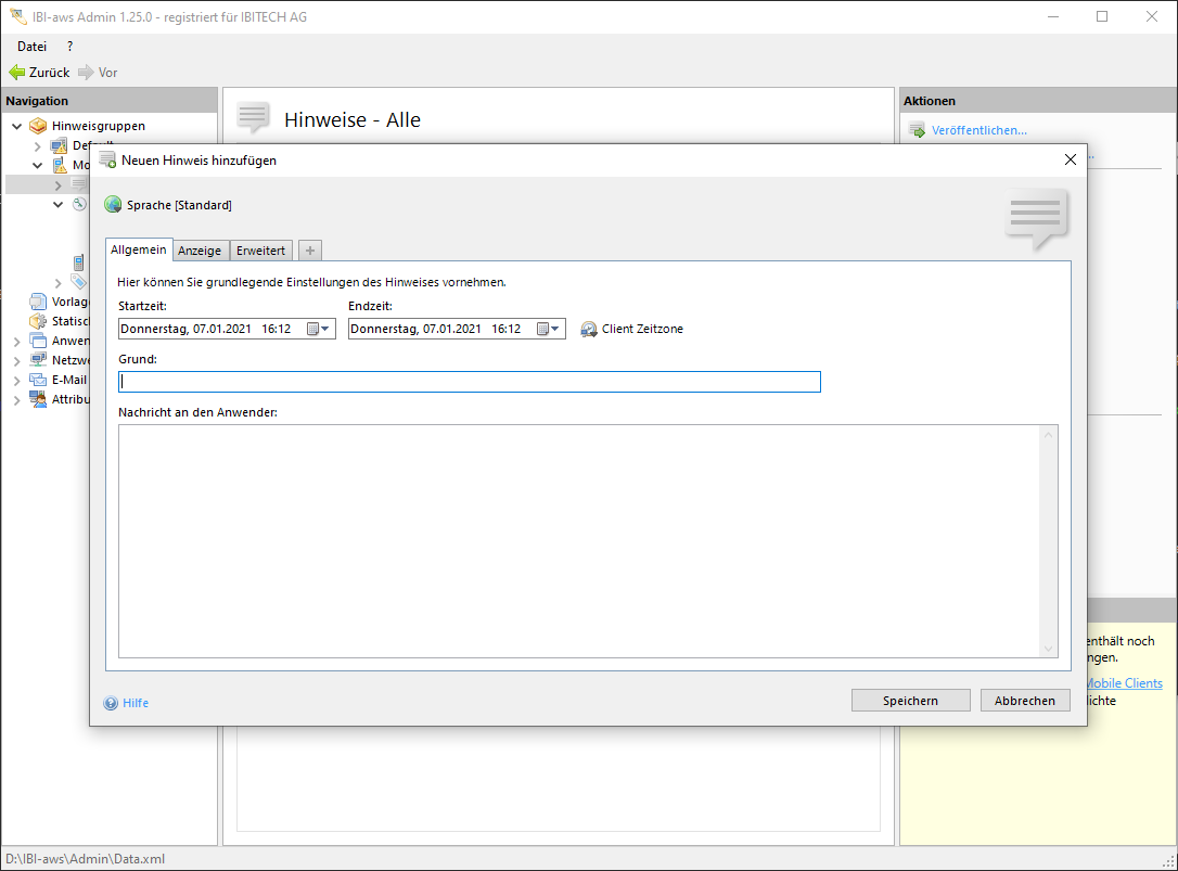 Um einen neuen Hinweis zu erstellen, wird in der Navigation der Hinweise-Eintrag unter der entsprechenden Hinweisgruppe ausgewählt. Anschliessend wird im Aktionen-Bereich die Funktion Neuen Hinweis hinzufügen eingeblendet.