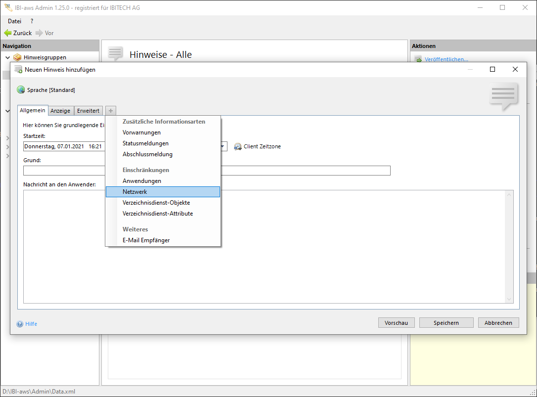 In diesem Reiter kann festgelegt werden, ob ein Hinweis nur für bestimmte IP-Adressen oder IP-Bereiche gelten soll. Ausschlüsse von bestimmen IP-Adressen oder IP-Bereiche können ebenfalls definiert werden.