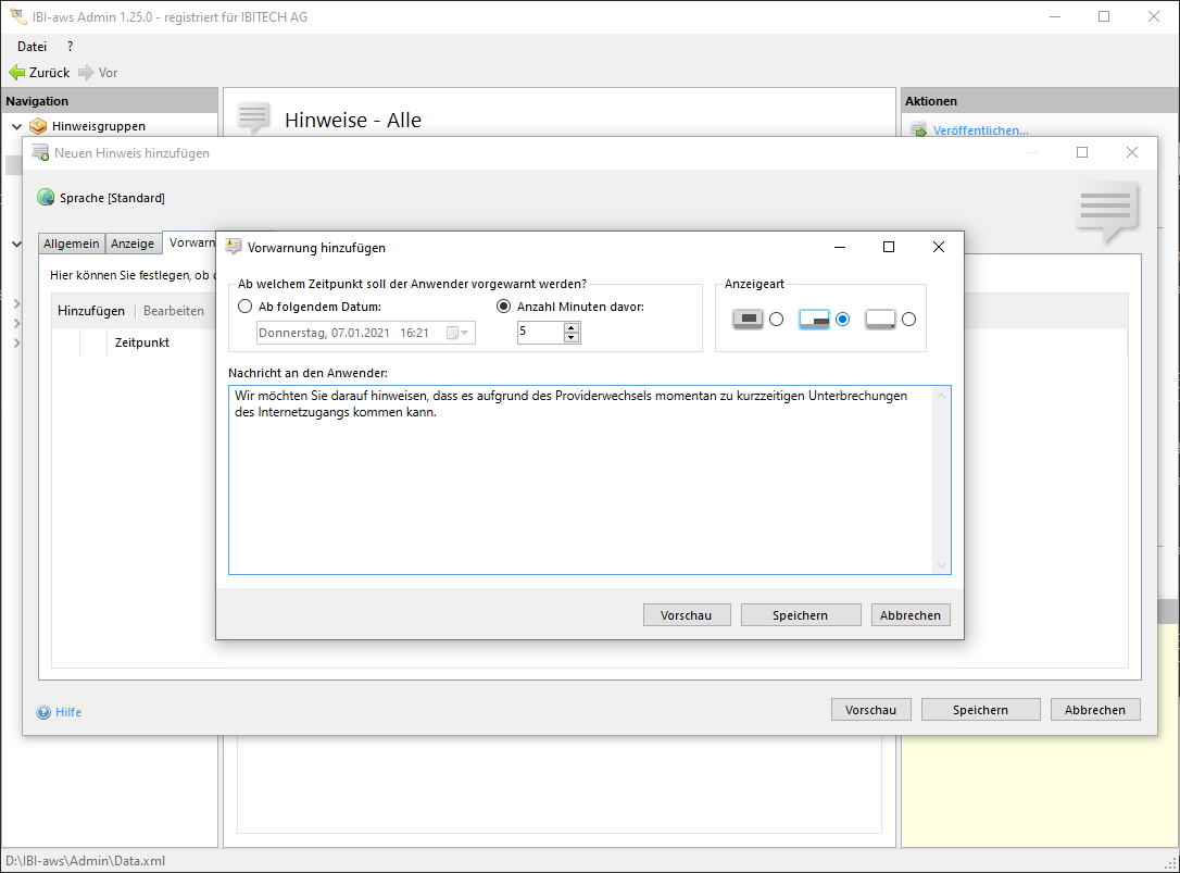 Mit einer Vorwarnung können die Anwender bei Bedarf bereits im Vorfeld über einen geplanten Unterbruch oder sonstige Ereignisse informiert werden.