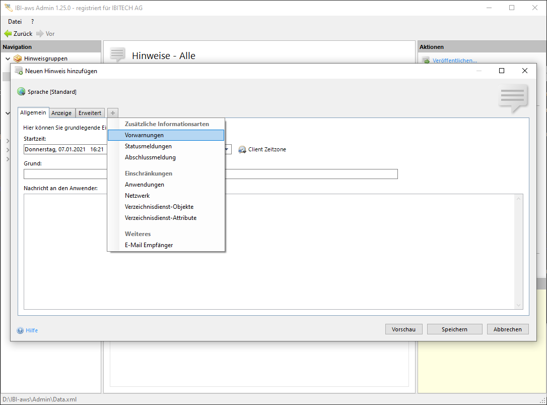 Wenn IBI-aws eine Anwendung erkennt, die dem Hinweis zugeordnet ist, dann wird die aktuelle Vorwarnung angezeigt. Erkennt IBI-aws dieselbe Anwendung noch einmal, wird diese Vorwarnung nicht wieder angezeigt.Deaktiviert