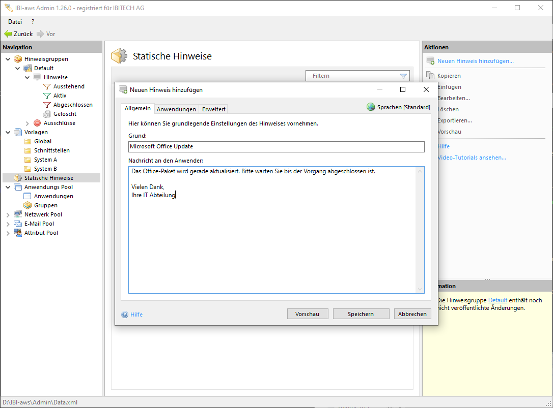 Sollen Anwender während einer Softwareverteilung darüber informiert werden, dass eine Anwendung nicht verfügbar ist, so kann dazu ein statischer Hinweis erstellt werden. Ein statischer Hinweis besitzt weder eine Start- noch eine Endzeit, er wird solange angezeigt, bis die entsprechende IBI-aws Client-Instanz (z.B. durch die Softwareverteilungsanwendung) beendet wird.