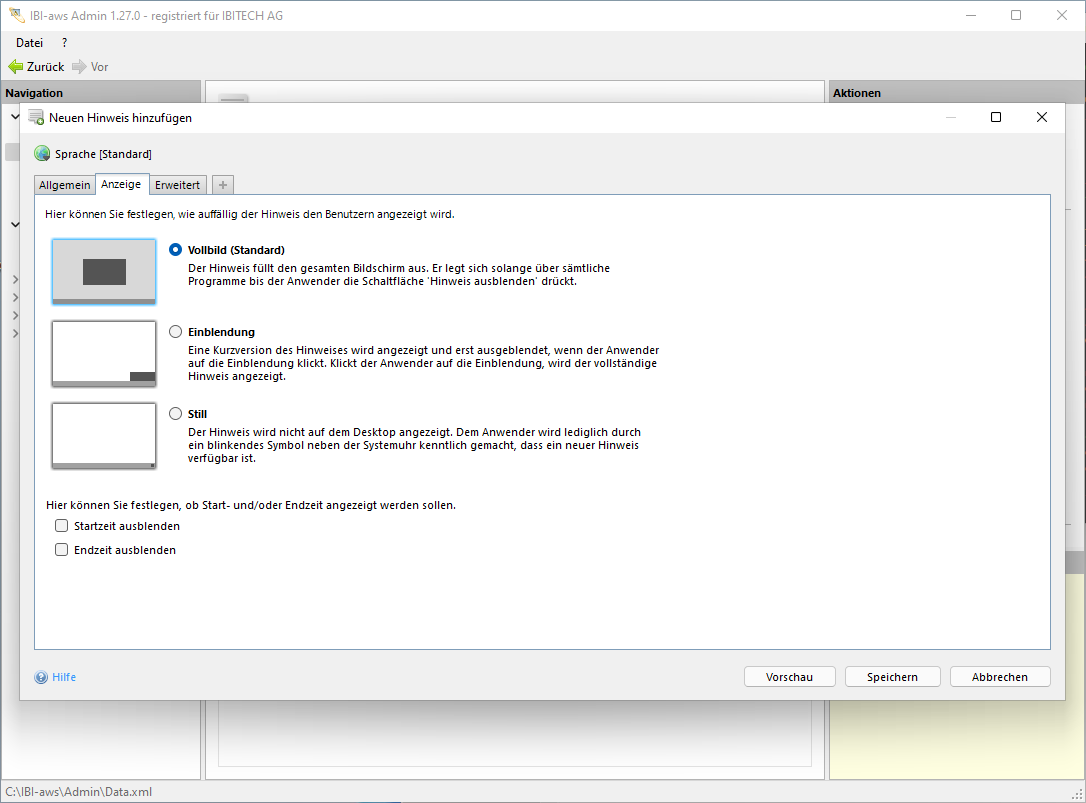 Im Bereich Anzeige kann definiert werden, wie prägnant der Hinweis den Benutzern angezeigt werden soll. Zusätzlich können bei Bedarf die Start- und/oder Endzeit ausgeblendet werden.