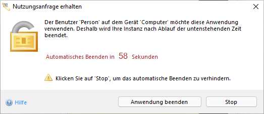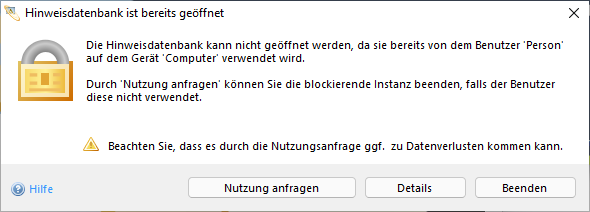 Wird die Hinweisdatenbank durch eine andere IBI-aws Admin Instanz blockiert, haben Sie die Möglichkeit, den blockierenden IBI-aws Admin Benutzer durch einen Klick auf Nutzung anfragen darauf hinzuweisen, dass Sie den Zugriff auf die Hinweisdatenbank benötigen. Die blockierende IBI-aws Admin Instanz zeigt daraufhin eine Meldung, welche den Benutzer zur Handlung auffordert. Ignoriert der Benutzer die Meldung (z.B. weil dieser nicht am Platz ist), beendet sich die blockierende IBI-aws Admin Instanz automatisch nach einer vorgegebenen Wartezeit von selbst.