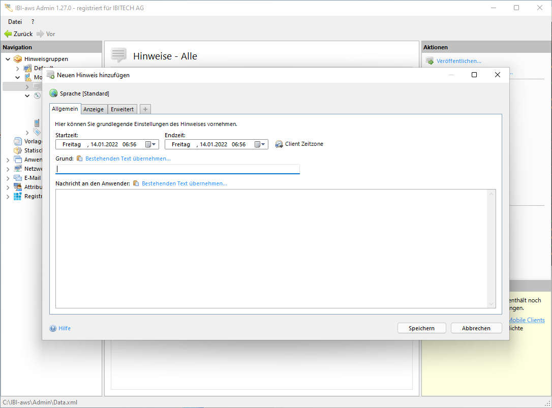 Um einen neuen Hinweis zu erstellen, wird in der Navigation der Hinweise-Eintrag unter der entsprechenden Hinweisgruppe ausgewählt. Anschliessend wird im Aktionen-Bereich die Funktion Neuen Hinweis hinzufügen eingeblendet.