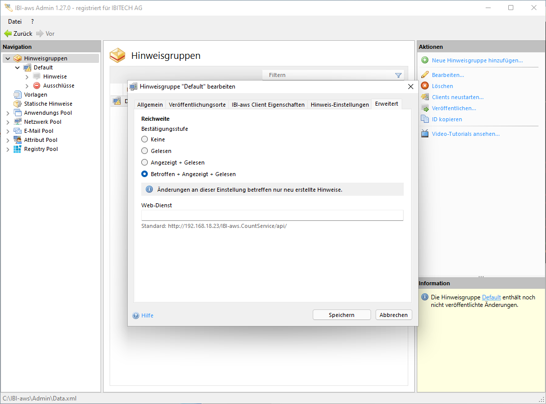 Abhängig von der eingestellten Bestätigungsstufe übermittelt jeder IBI-aws Client pro Hinweisfragment (z.B. Hinweis, Vorwarnung oder Abschlussmeldung) entsprechende Bestätigungen an den konfigurierten Web-Dienst. Im IBI-aws Admin kann somit dann pro Bestätigungsstufe die entsprechende Anzahl angezeigt werden.