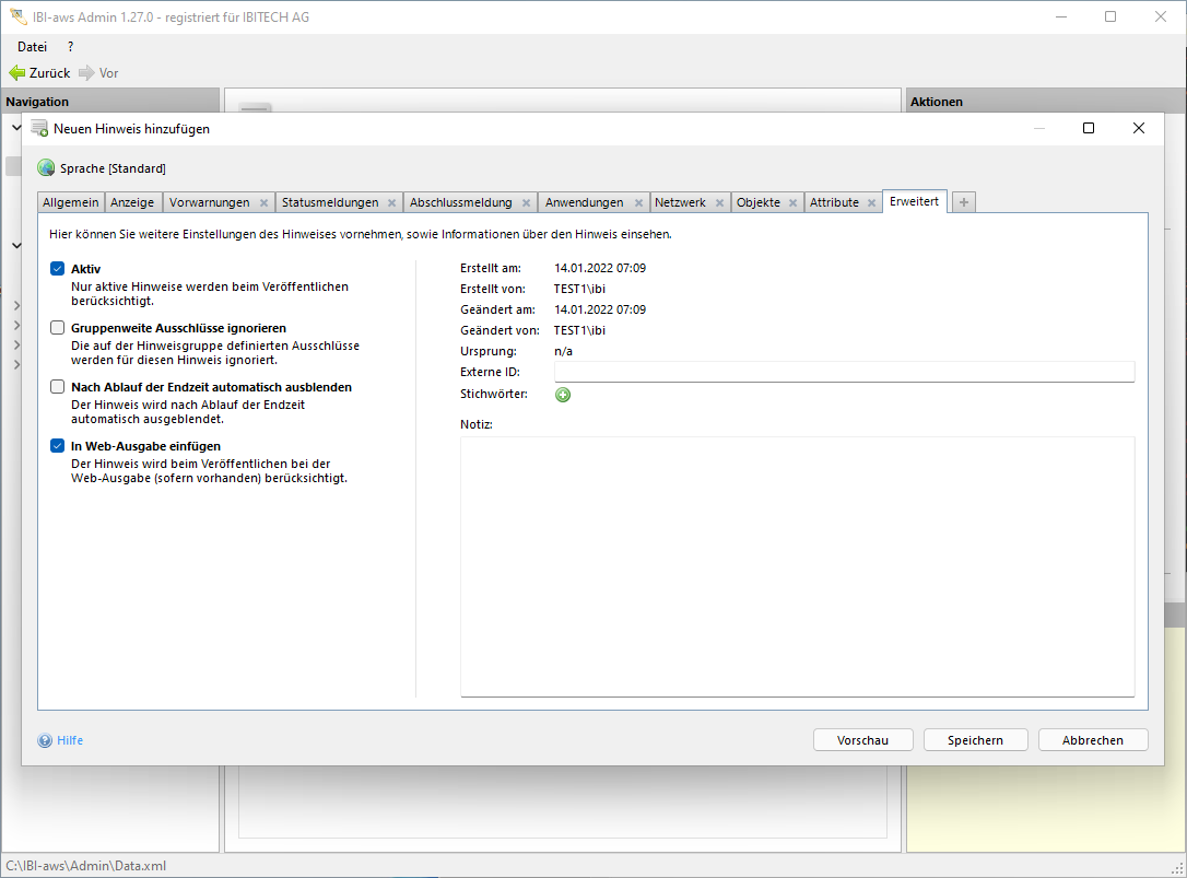 Im Reiter Erweitert können weitere Einstellungen und Informationen über den Hinweis eingesehen bzw. festgelegt werden.