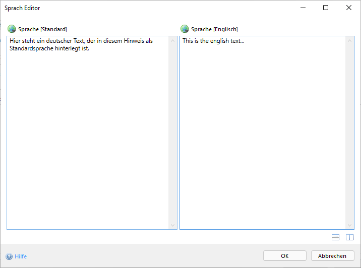Die Texteingabe kann auf zwei unterschiedliche Varianten erfolgen. Entweder wird der Text wie gewohnt direkt in die dafür vorgesehenen Felder eingegeben, oder es wird der neue Sprach Editor genutzt. Letztere Variante ist insbesondere bei längeren Texten empfehlenswert, da neben der Texteingabe für die neue Sprache zusätzlich ein beliebiger Text einer anderen, bereits eingegebenen Sprache, zum Vergleich angezeigt werden kann.