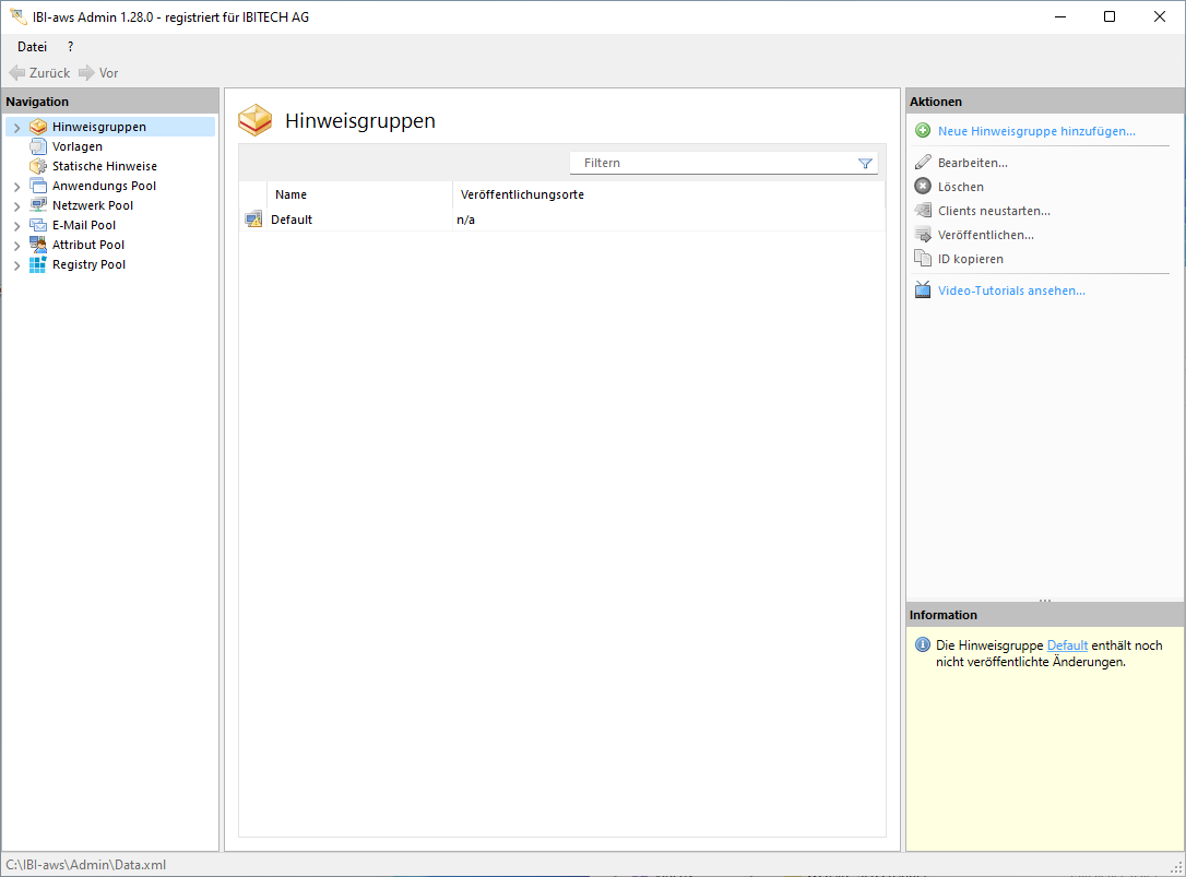 Auf der linken Seite befindet sich die Navigation, welche Zugang zu den HinweisgruppenVorlagen, statischen Hinweisen, dem Anwendungs Pool, Netzwerk Pool, E-Mail PoolAttribut Pool sowie Registry Pool bietet.