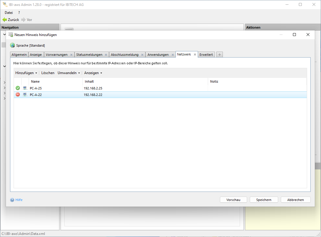 In diesem Reiter kann festgelegt werden, ob ein Hinweis nur für bestimmte IP-Adressen oder IP-Bereiche gelten soll. Ausschlüsse von bestimmen IP-Adressen oder IP-Bereiche können ebenfalls definiert werden.