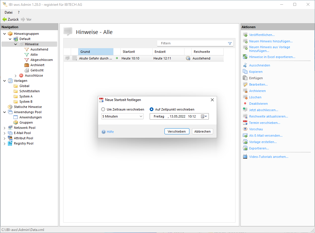 Die Aktion Termin verschieben wird verwendet, um den Anzeigezeitpunkt eines Hinweises zu verschieben. Durch die Verschiebung wird der Hinweis nicht mehr zum ursprünglich festgelegten Zeitpunkt angezeigt, sondern zu dem Zeitpunkt, welcher innerhalb dieser Aktion definiert wird. Als Referenz für die Verschiebung dient die Startzeit der Hauptmeldung. Diese kann entweder um einen Zeitraum verschoben oder direkt auf einem neuen Zeitpunkt festgelegt werden.