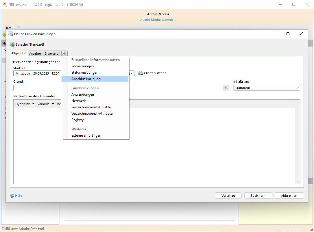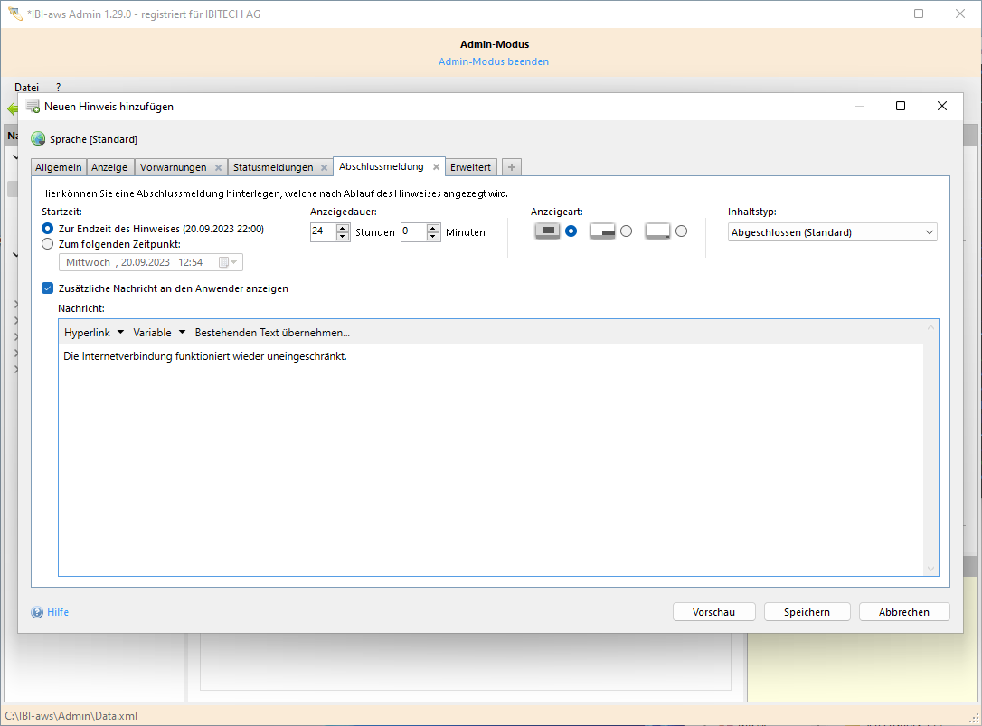 Eine Abschlussmeldung wird verwendet, um alle Empfänger des Hinweises darüber zu informieren, dass die mit dem Hinweis übertragene Information (z.B. Incident) abgeschlossen wurde. Die Abschlussmeldung wird nur den Anwendern angezeigt, die den Hinweis selbst gesehen haben. Die Anzeigedauer legt dabei fest, wie lange nach der Endzeit des Hinweises die Abschlussmeldung gültig ist.