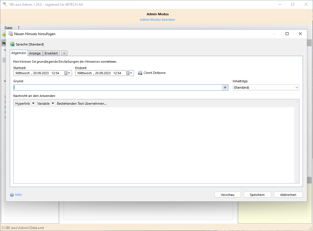 Ab IBI-aws Version 1.10 steht die Möglichkeit zur Verfügung, einen Hinweis in unterschiedlichen Sprachen zu verfassen, um im internationalen Umfeld noch besser informieren zu können. Mehr dazu finden Sie unter Mehrsprachigkeit