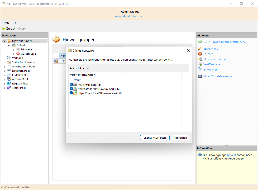 Mittels der Funktion Clients neustarten können alle zu der Hinweisgruppe gehörenden IBI-aws Clients neugestartet werden. Diese Funktion wird verwendet um Aktualisierungen einzuspielen.