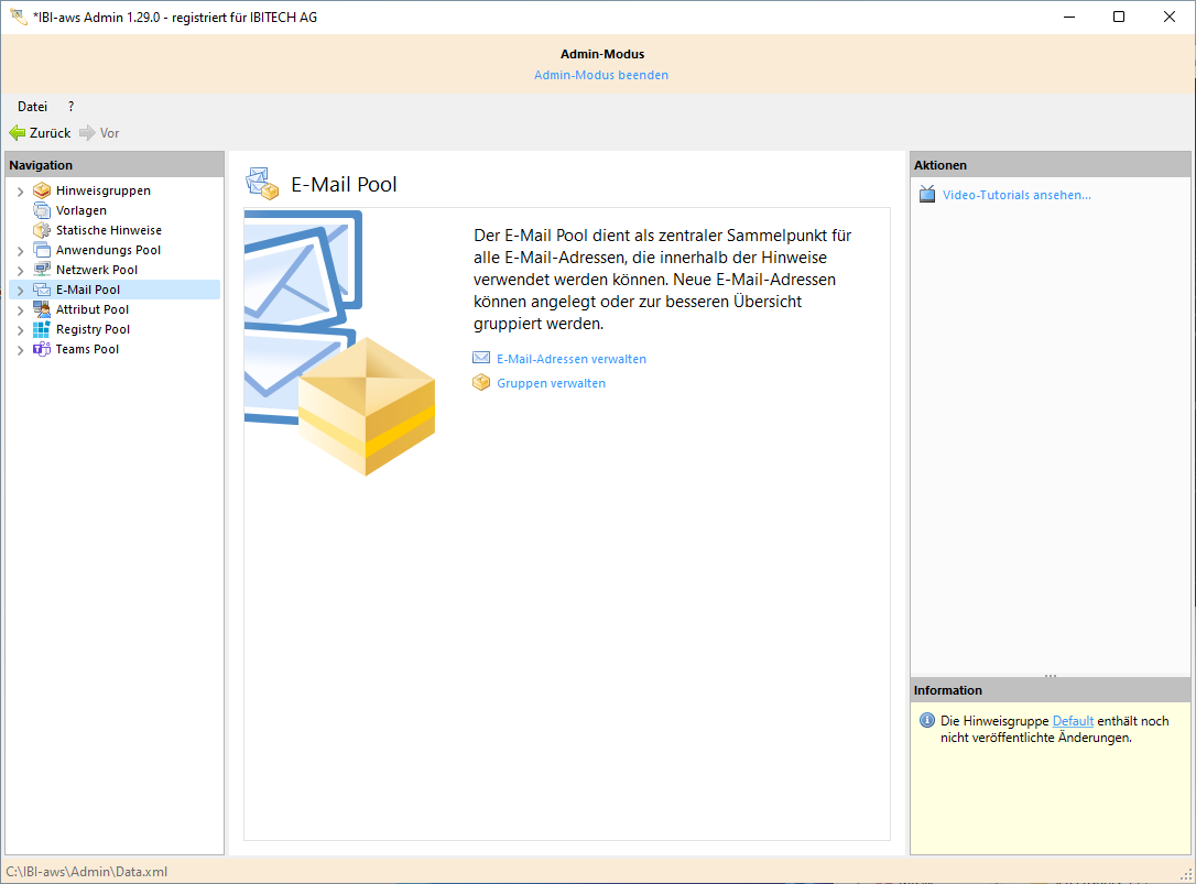Der E-Mail Pool dient als zentraler Sammelpunkt für alle E-Mail-Adressen, die gegebenenfalls für die Versendung eines Hinweises benötigt werden. Zur besseren Übersicht können E-Mail Adressen analog zu den anderen Pools gruppiert werden.