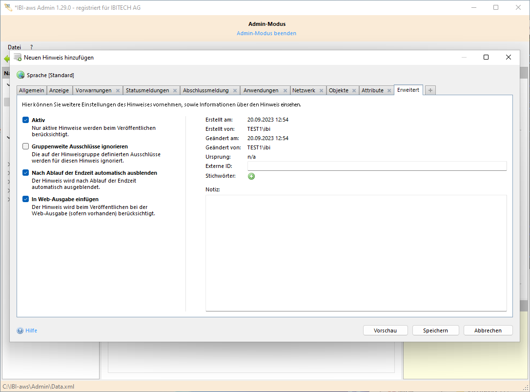 Im Reiter Erweitert können weitere Einstellungen und Informationen über den Hinweis eingesehen bzw. festgelegt werden.