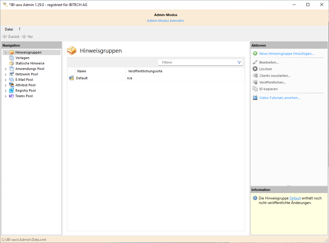 Auf der linken Seite befindet sich die Navigation, welche Zugang zu den Hinweisgruppen, Vorlagen, statischen Hinweisen, dem Anwendungs Pool, Netzwerk Pool, E-Mail Pool, Attribut Pool sowie Registry Pool bietet.