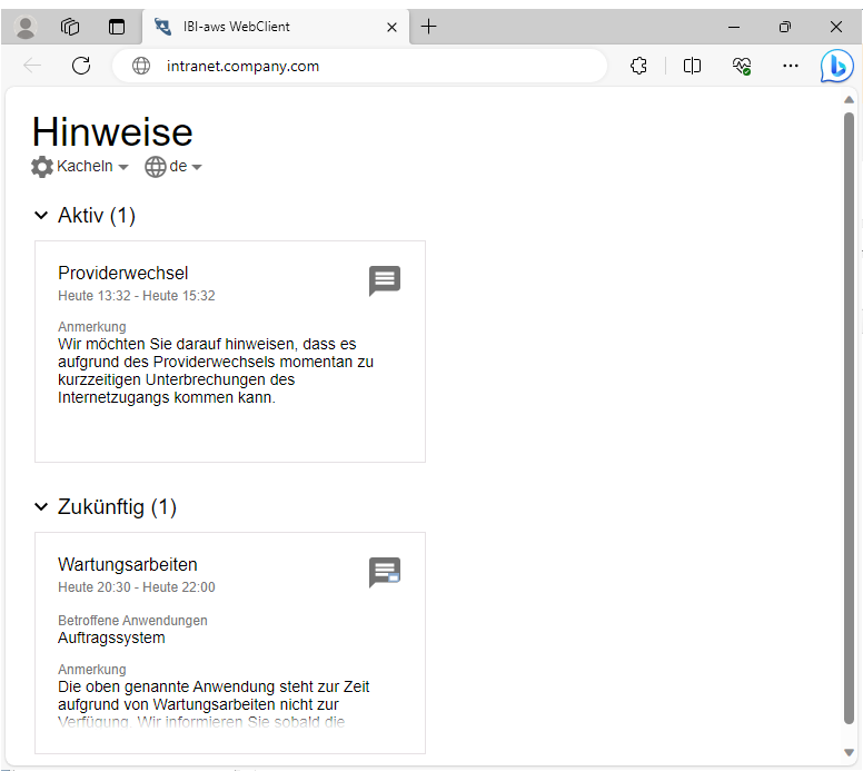 Mit dem IBI-aws WebClient können Hinweise in einer Webseite dargestellt werden, welche z.B. im Intranet verfügbar gemacht werden kann.