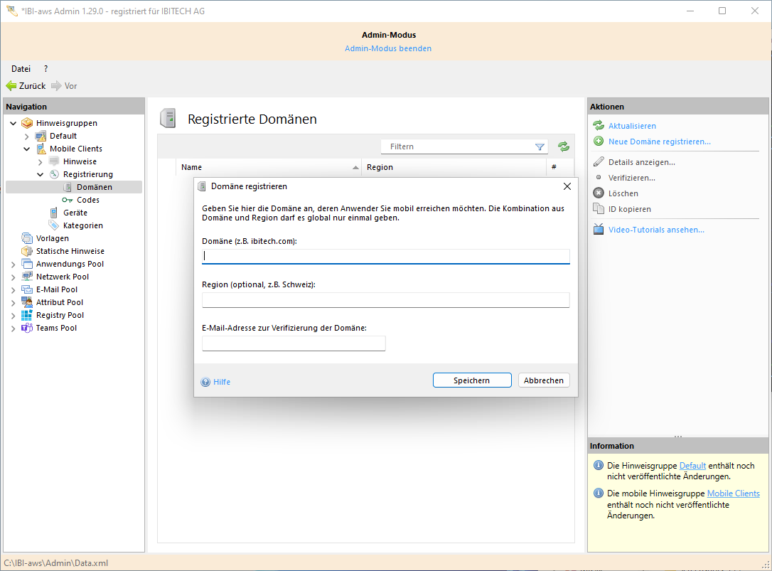 Durch das Registrieren einer Domäne, können Hinweise an die zur Domäne gehörenden IBI-aws MobileClient Anwender versendet werden. Nach der Registrierung wird ein Bestätigungscode an die hinterlegte E-Mail Adresse versendet, um die Domäne verifizieren zu können.