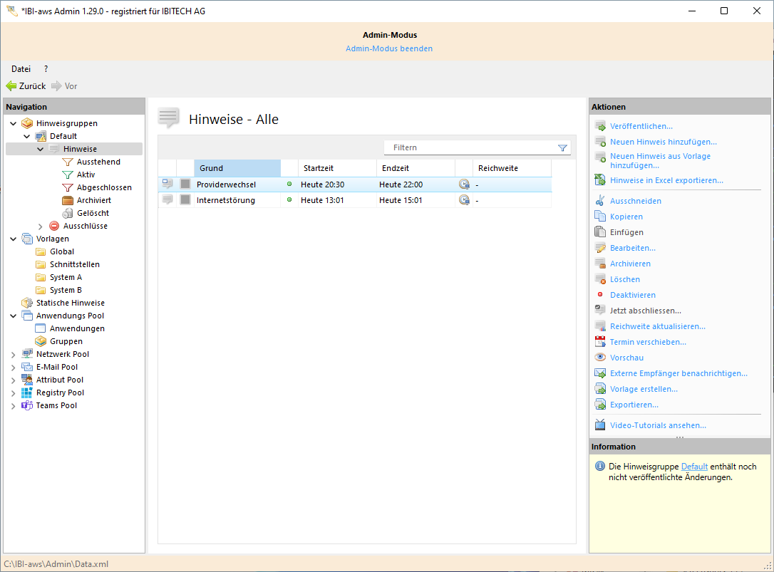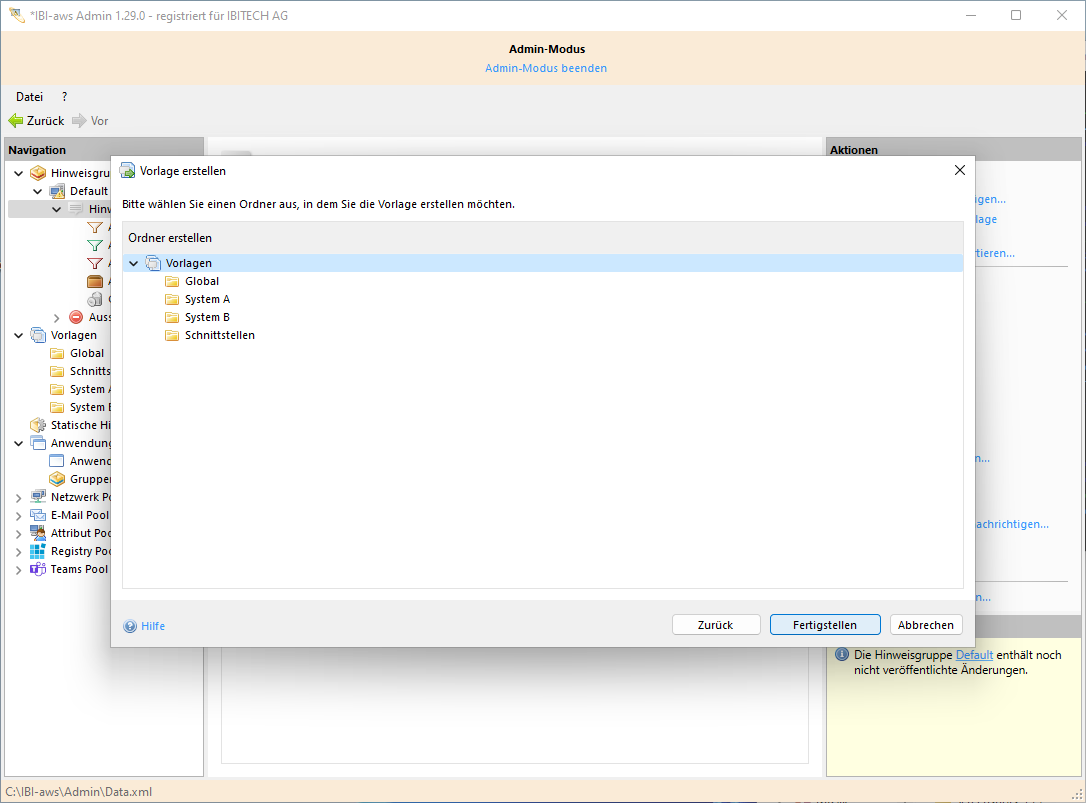 Ein bestehender Hinweis aus der Hinweisliste einer Hinweisgruppe kann per Drag and Drop in einem Vorlagenordner im Navigationsbereich geschoben werden.