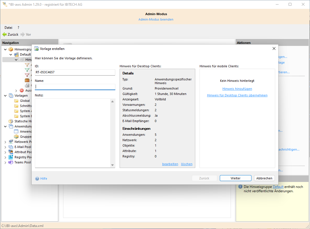 Um eine Vorlage erstellen zu können, wird neben einem Hinweis für Desktop Clients und/oder einem Hinweis für mobile Clients, welche jeweils über den Link Hinweis hinzufügen in der jeweiligen Box hinzugefügt werden können, zusätzlich eine eindeutige ID (um die Vorlage später einfacher wiederfinden zu können) und ein Name benötigt. Bei Bedarf kann auch eine Notiz hinterlegt werden.