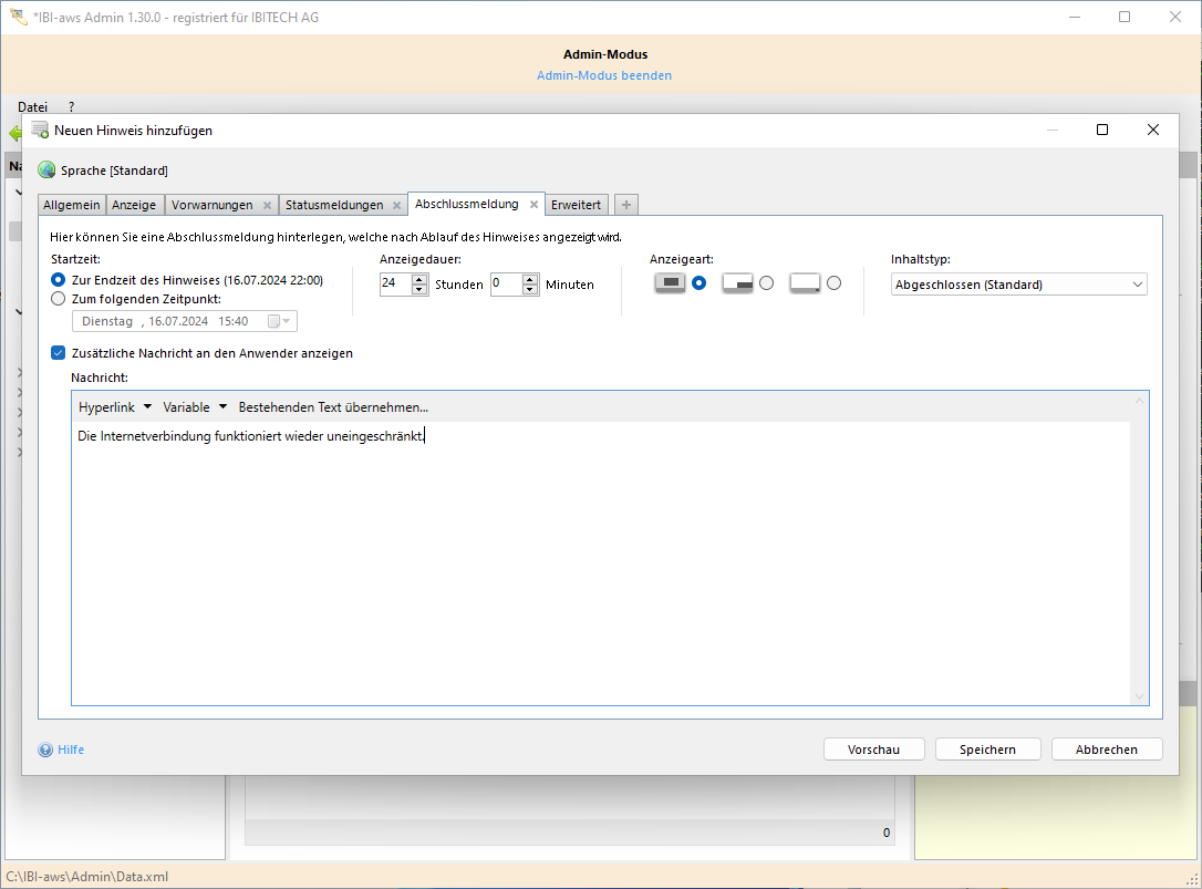 Eine Abschlussmeldung wird verwendet, um alle Empfänger des Hinweises darüber zu informieren, dass die mit dem Hinweis übertragene Information (z.B. Incident) abgeschlossen wurde. Die Abschlussmeldung wird nur den Anwendern angezeigt, die den Hinweis selbst gesehen haben. Die Anzeigedauer legt dabei fest, wie lange nach der Endzeit des Hinweises die Abschlussmeldung gültig ist.
