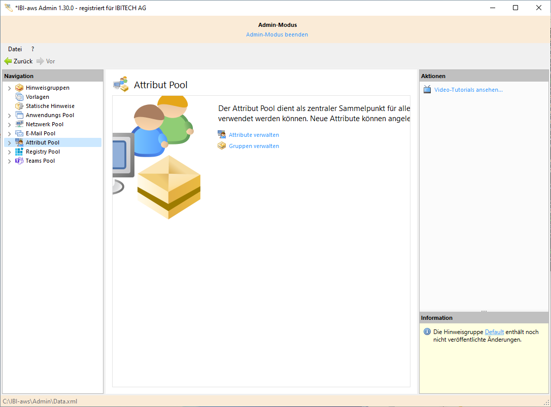Der Attribut Pool dient als zentraler Sammelpunkt für alle Verzeichnisdienst-Attribute, die innerhalb der Hinweise verwendet werden können. Neue Attribute können angelegt, oder zur besseren Übersicht gruppiert werden.