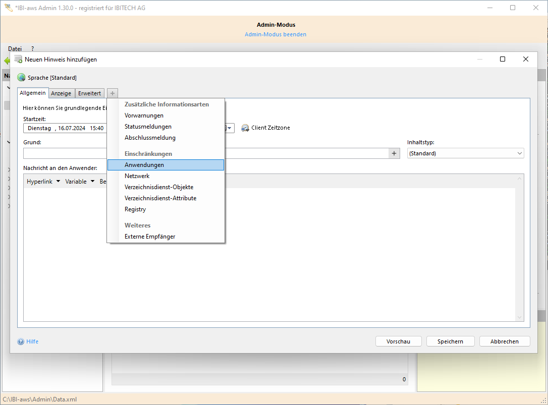 Der anwendungsspezifische Hinweis basiert auf dem allgemeinen Hinweis, erweitert ihn jedoch um die Bedingung Anwendungen. Für einen anwendungsspezifischen Hinweis wird mindestens eine Anwendung festgelegt, die als Auslöser für die Anzeige des Hinweises dient. Das heisst, der Hinweis wird dem Benutzer nur dann angezeigt, wenn auf seinem Rechner die angegebene Anwendung ausgeführt wird. Diese Hinweisart eignet sich besonders dann, wenn Sie nur Anwender informieren möchten, welche die festgelegte Anwendung verwenden. Somit werden Anwender, welche diese Anwendung nie verwenden auch nicht unnötigerweise informiert.