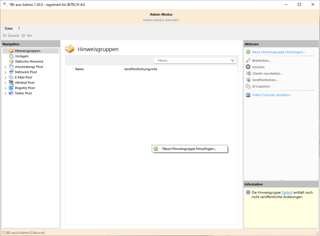 Um eine neue Hinweisgruppe anzulegen, wird der Menüpunkt Hinweisgruppe hinzufügen verwendet. Dieser Menüpunkt erscheint unter Aktionen, sobald in der Navigation der Eintrag Hinweisgruppen ausgewählt wird. Alternativ kann dieser Menüpunkt auch durch einen Rechtsklick im Inhalts-Bereich mittig erreicht werden.