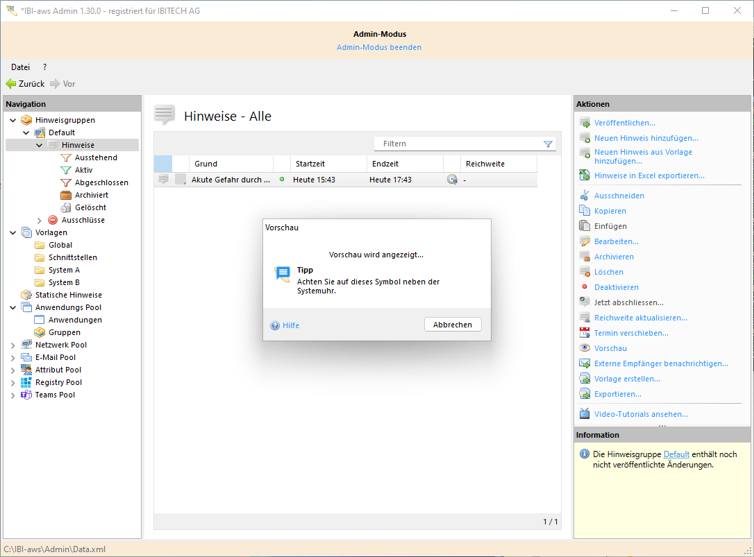 Je nach gewählter Anzeigeart des Hinweises wird nach dem Starten der Vorschau der Hinweis entsprechend angezeigt. Solange der Hinweis angezeigt wird, weist der IBI-aws Admin mit einem Fenster (Abbildung 1) darauf hin. In diesem Fenster befindet sich eine Schaltfläche, mit deren Hilfe die Vorschau beendet werden kann. Die Vorschau beendet sich auch dann, wenn Sie den Hinweis über dessen Schaltfläche Hinweis ausblenden schliessen.