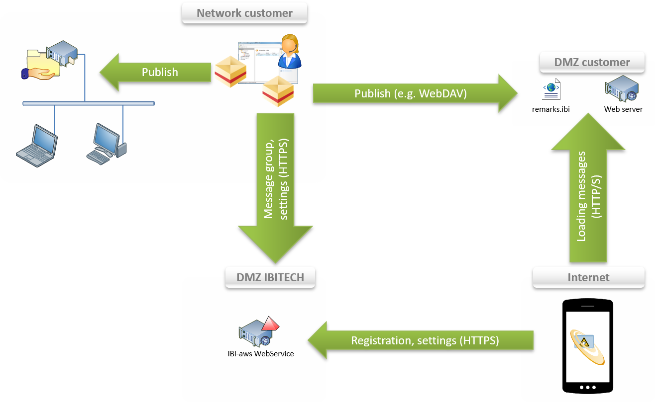 When a message group for mobile clients is created, the ID and the public client access path are stored on the IBI-aws Webservice. This is necessary to provide a connection between the mobile device and the message group and accordingly the message file.