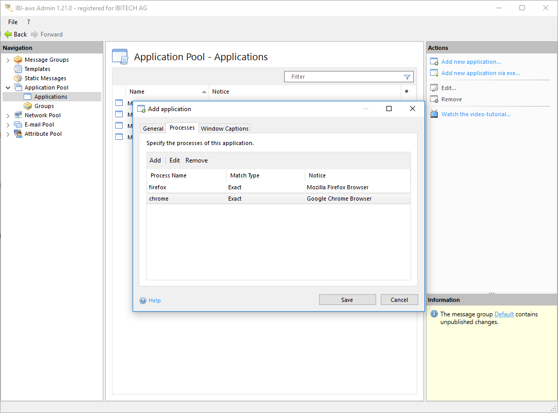 The action Add new application is available in the Application Pool. Clicking on this action opens a dialog box in which the properties of the application can be set.