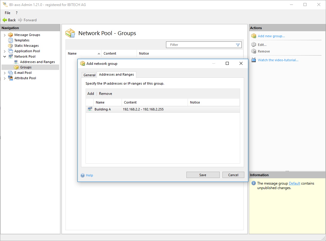 To create a group, select Groups under Network Pool in the Navigation pane. Add new group will then be available in the Actions pane.