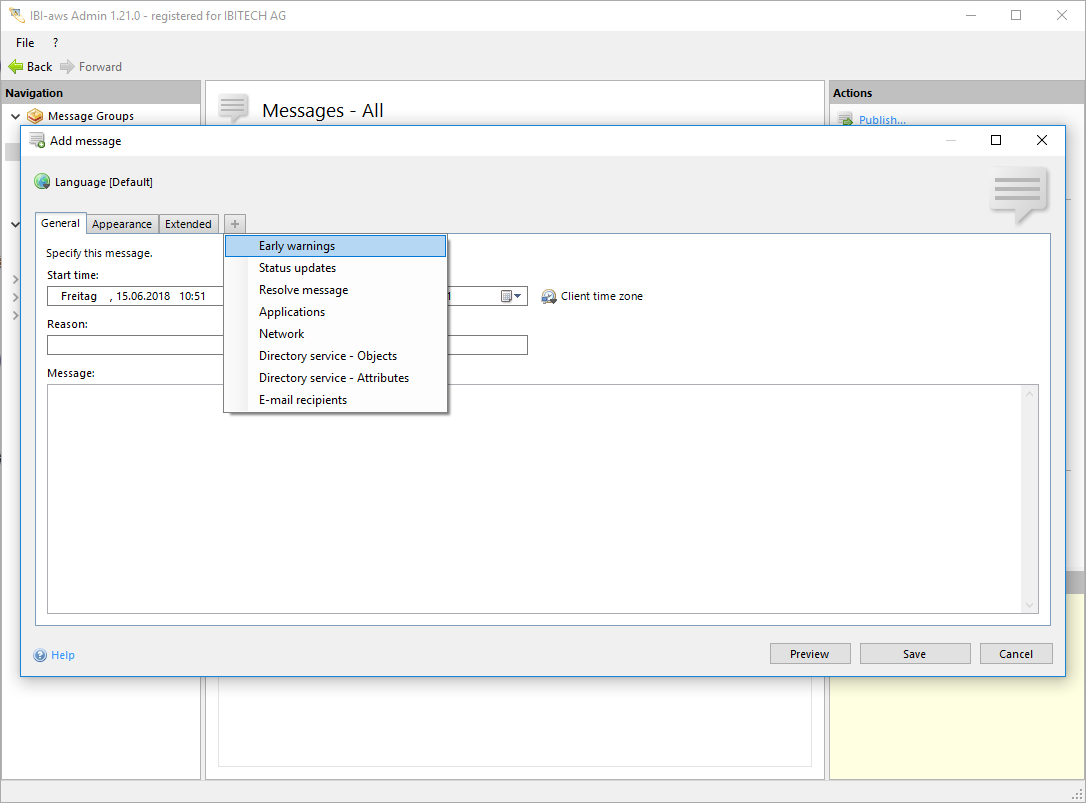 If IBI-aws recognizes an application that is assigned to the message the current warning will be displayed. If IBI-aws recognizes the same application again the warning will not be displayed again. Every warning will always be displayed once. They will be displayed if the user uses or starts an application, which has been specified as a trigger within the message. - Disabled