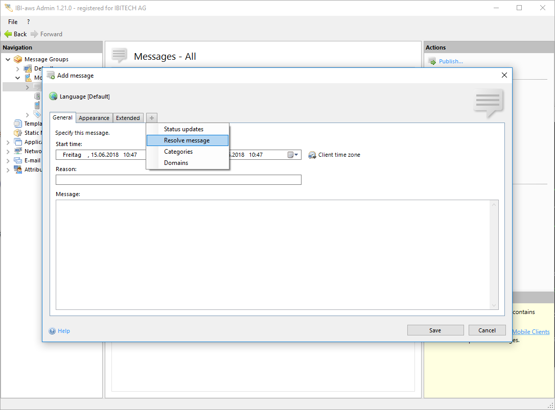 A resolve message serves to inform all message recipients about the resolve of the information (e.g. incident) that has been transported by the message. The resolve message will only be displayed to users that have seen the original message before. The display duration specifies how long the resolve message should be valid after the message' end time.