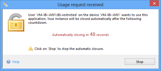 The blocking IBI-aws Admin instance will show a message which spur the user into action. If the user ignores the message (e.g. because he is not at his place), the IBI-aws Admin instance will close itself after a suitable delay.