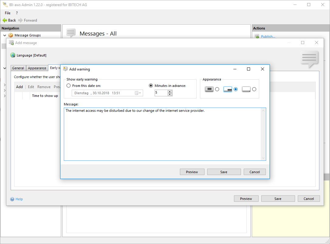 If IBI-aws recognizes an application that is assigned to the message the current warning will be displayed. If IBI-aws recognizes the same application again the warning will be displayed once more. Warnings can be displayed several times. They will be displayed whenever using an application or restarting an application that has been specified as a trigger within the message.